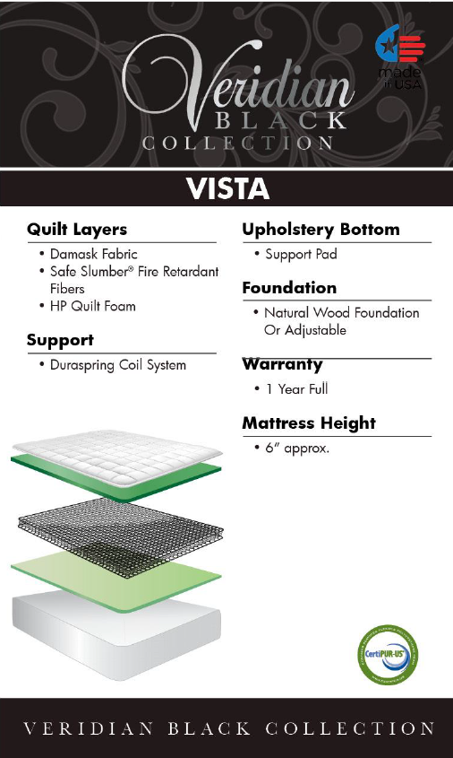 Mattress pads are available as Twin or Full, 6″-thick pads made of fire-retardant quilted fabric, foam, and coil. Included is a 1-year warranty. Bases are a fabric-wrapped wood frame that elevates the mattress from the floor and provides additional support without need of a box spring.