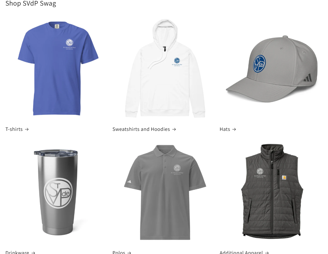 Choose from a selection of popular apparel or create your own SVdP Georgia items to wear. Just a sample of what’s possible is pictured! https://svdpgeorgiastore.com/